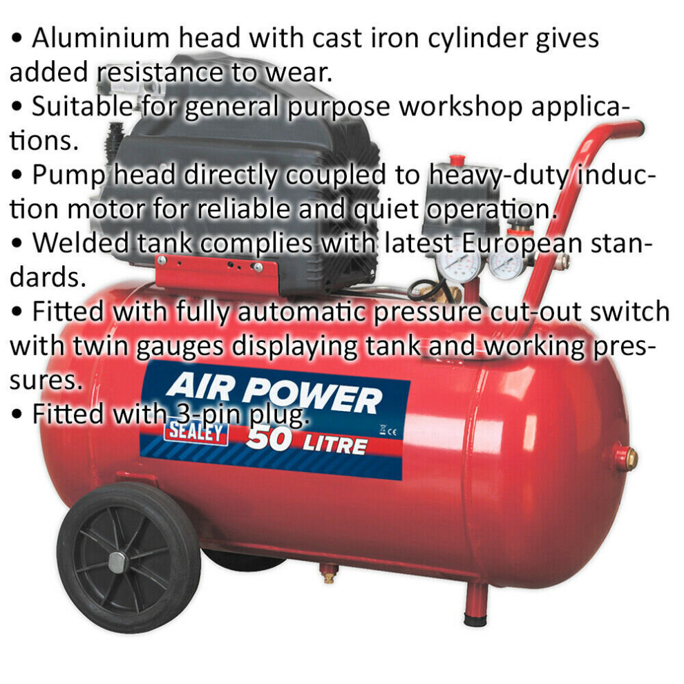 50 Litre Direct Drive Air Compressor - 2hp Motor - Automatic Pressure Cut-Out Description